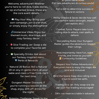 Join us for cozy evenings of dice rolls, dungeons & dragons lore, and delicious tea. Whether you're a seasoned DM, adventurer, or a curious newcomer, our tea shop transforms into a whimsical realm of quests, camaraderie, and house-made brews. Sip Happy Heart & Honey Healing Potion while you slay goblins, or toast your party with our Chai Spiced & Vanilla Rogue's Respite as you unlock ancient secrets.